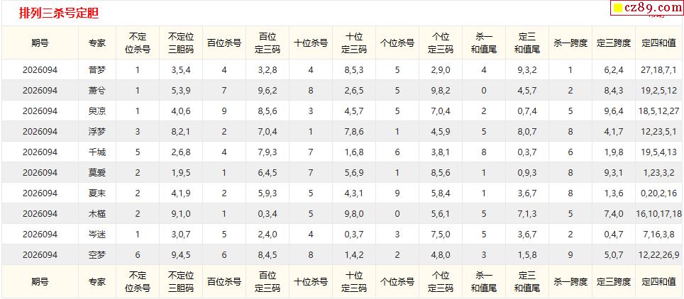 > 26年094期彩宝贝专家体彩P3杀号定码图表